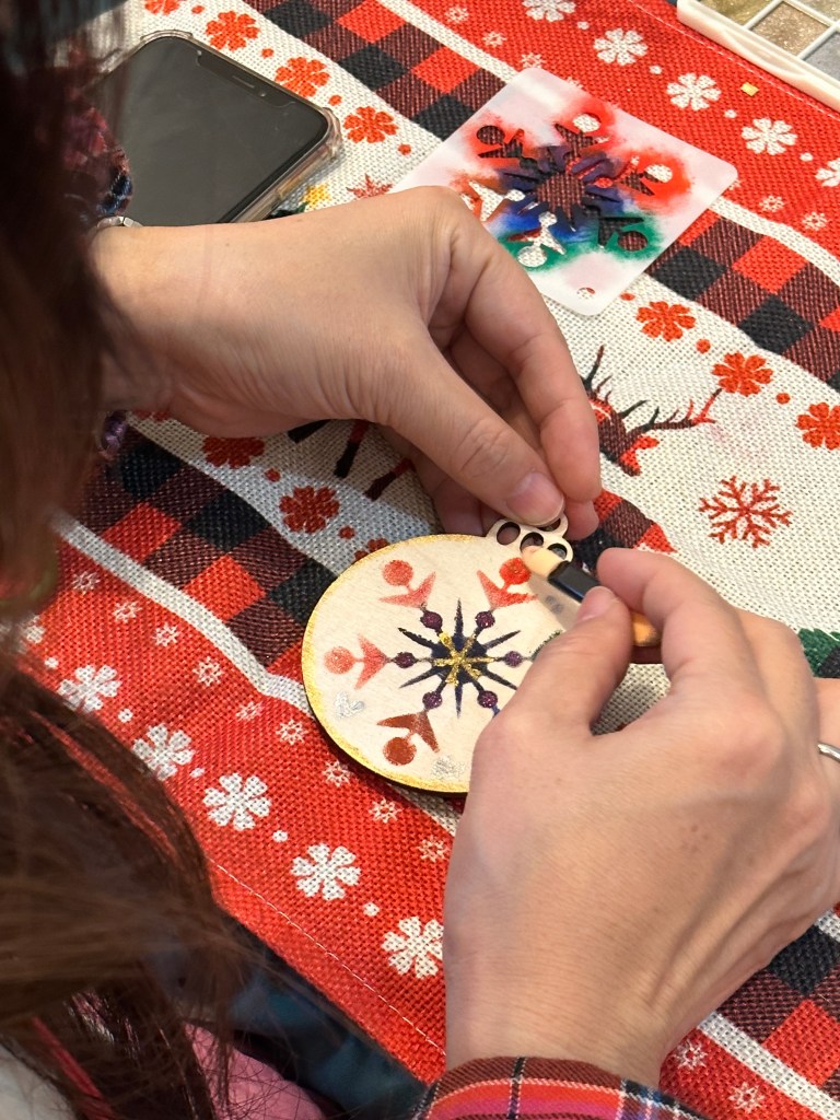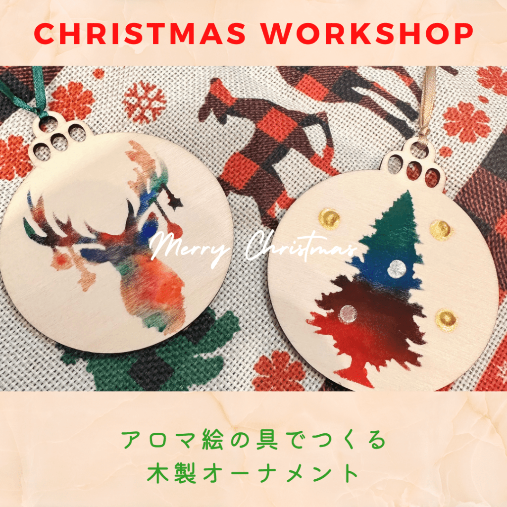 木製のオーナメントにアロマ絵の具を使用してクリスマスのイラストを描くワークショップです。(イラストはクリスマス仕様のステンシルから選んでいただきます)