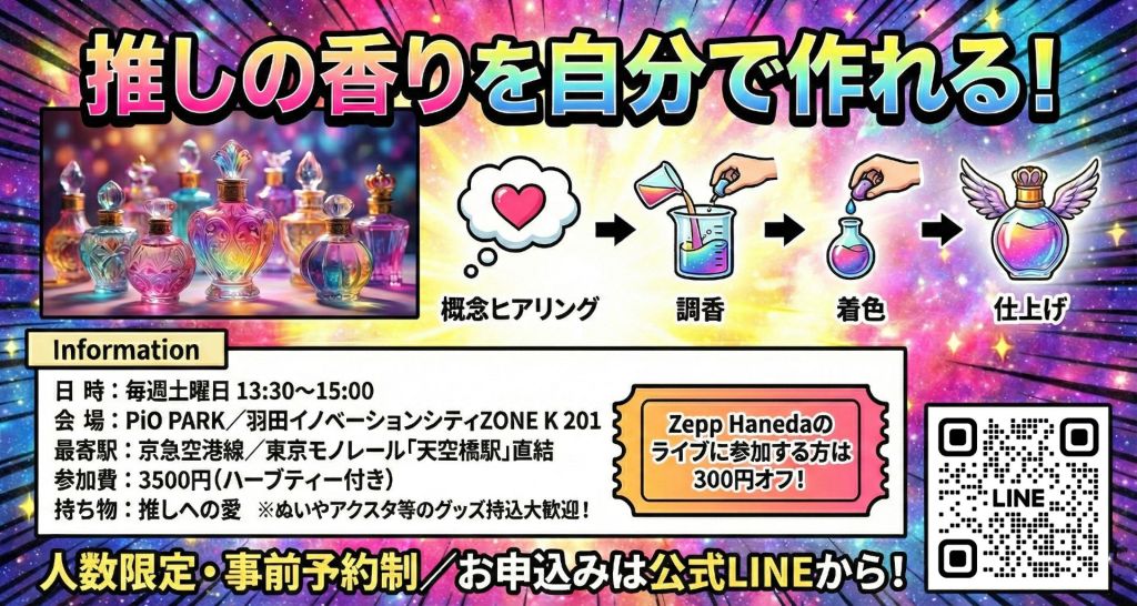 「概念爆発!推しの香りワークショップ」は、人数限定・事前予約制での開催となります。
